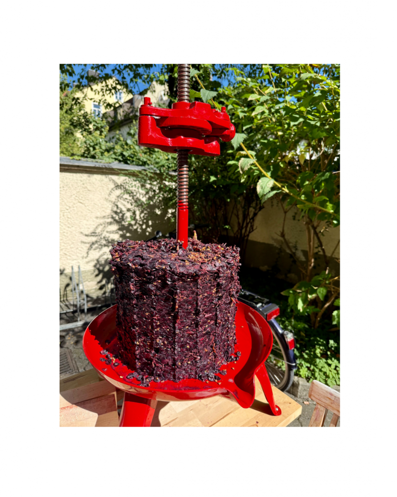 On the following weekend, I called my neighbors for sparkling wine and help – we pressed the pinot noir on the first weekend of Oktoberfest and transferred 37 liters to a floating-top steel vessel and a demijohn. We carried the crushed and slightly bubbling grapes, and pressed must up and down in buckets, and did all the washing and cleaning within a couple of hours. I was proud and felt humbled to get such amazing help.