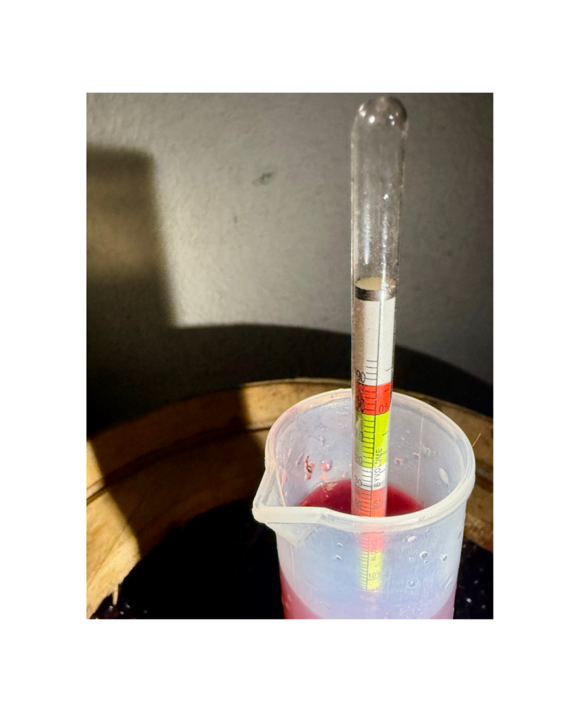 When you imagine a wine fermenting in a vessel, you can expect two things: smell and bubbles. Whenever I entered the basement, there was a slight fizz audible from the steel vessel. The barrel was silent. So you had to open it and listen carefully: there was fizz too. Little, but ongoing. Patience was the trick now.